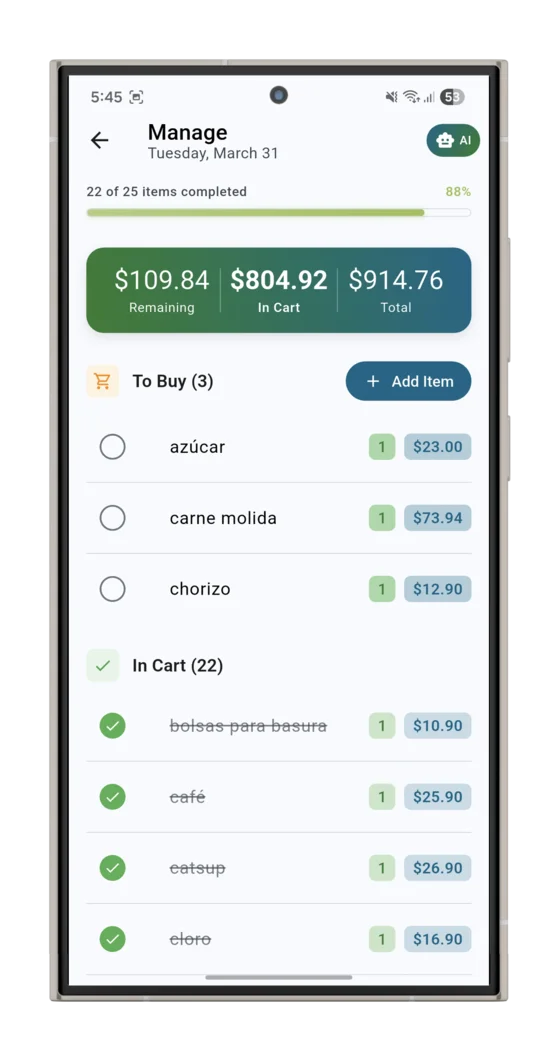 "Add everything for tacos." "What did I spend last Saturday?" AI helps you manage the list hands-free — review every suggestion before it's applied.
